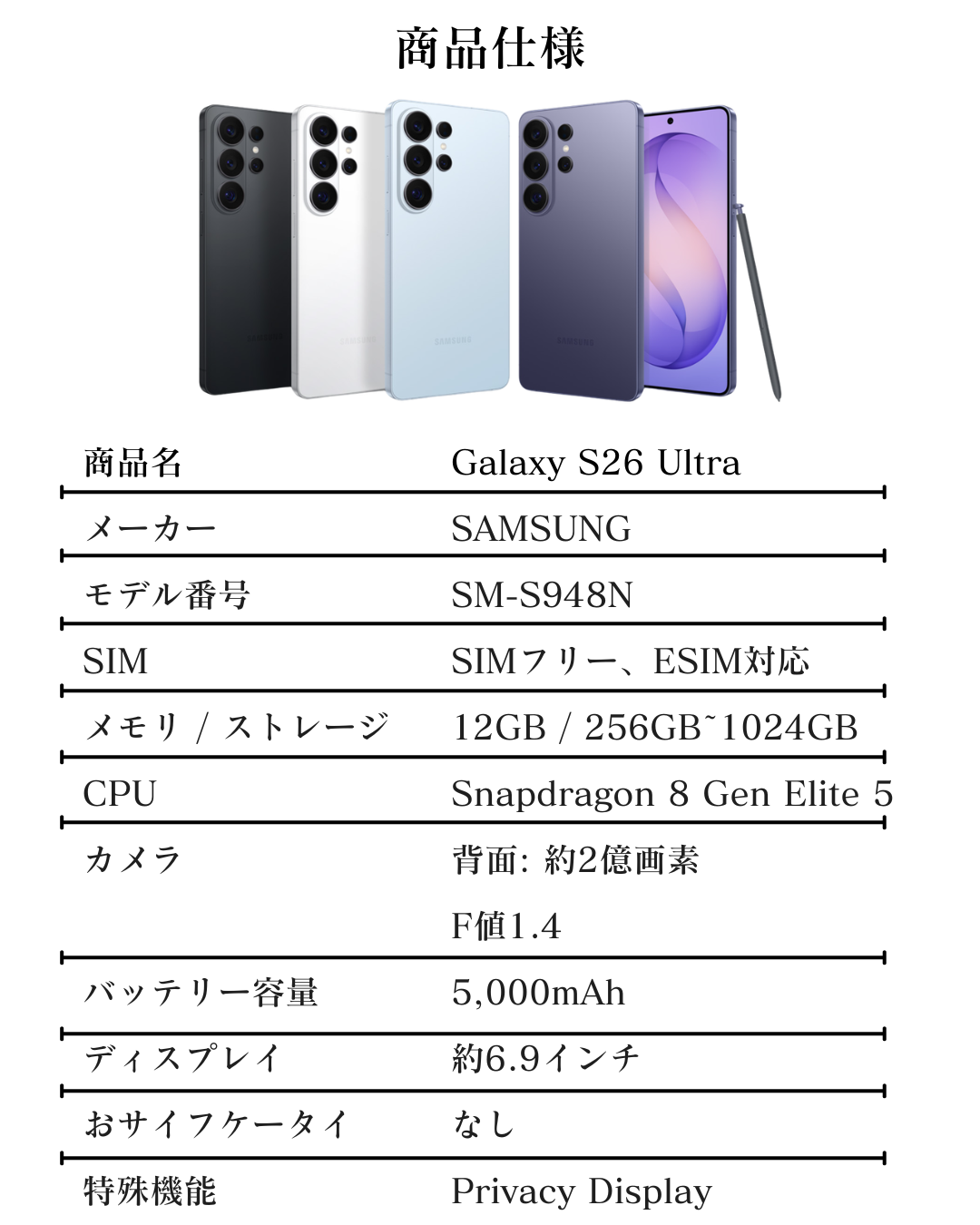 ![S26 Ultra SIMフリー[新品]](http://ncmobile.jp/cdn/shop/files/s26_7_1d9d3407-19cc-41e0-97a1-1321779bf1b3.png?v=1772173824&width=750)